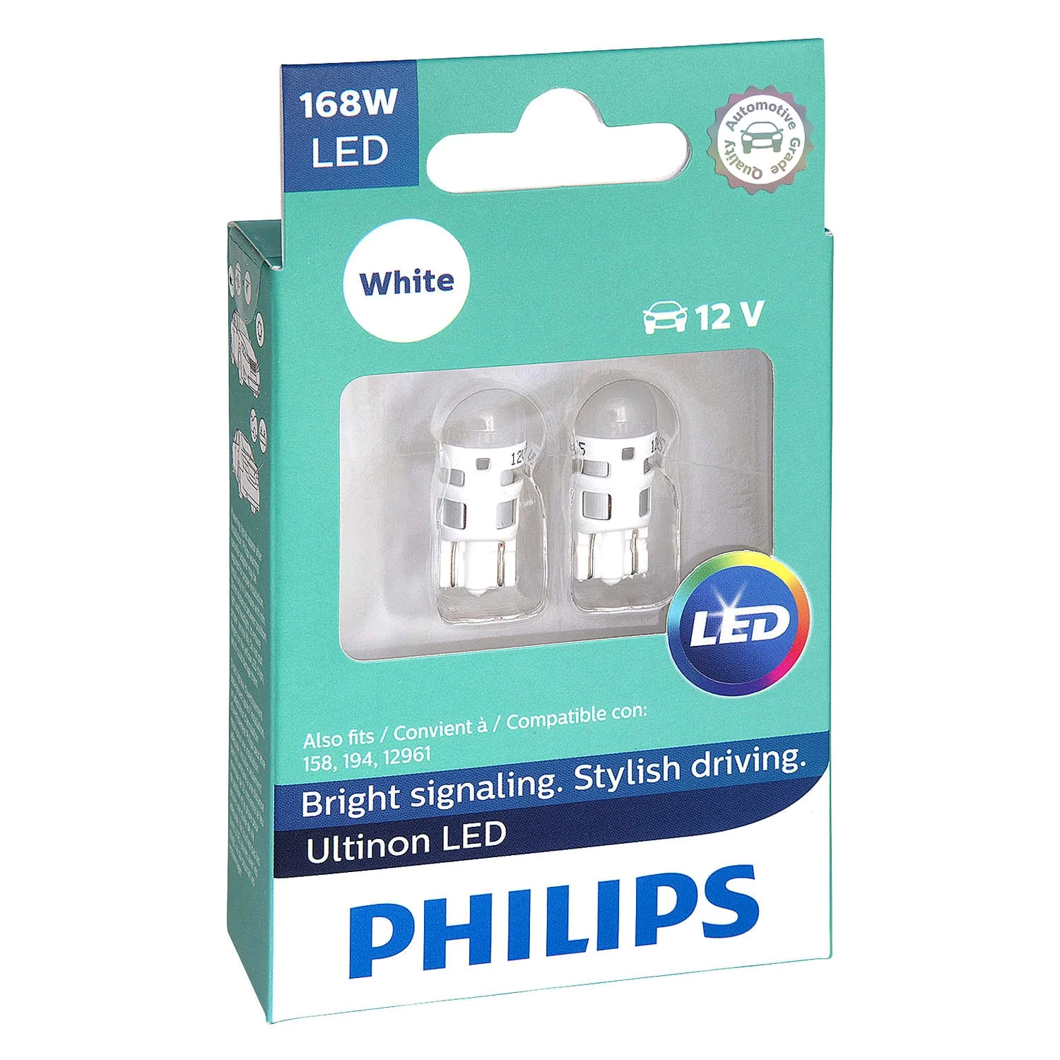 Ultinon LED Bulbs (168) (168WLED) by Philips®. 1 Pair, white color bulbs, 12V, 6000K. Replace your standard car bulbs with long lasting Philips Ultinon LED bulbs. They are a direct replacement for incandescent bulbs and are resistant to extreme heat and high vibrations. One look at their top-of-the-line design tells you these bulbs are like nothing you have seen before – Ultinon LED bulbs have been engineered to provide outstanding performance and ensure great longevity. Plus, they are backed by a 12-year limited warranty.