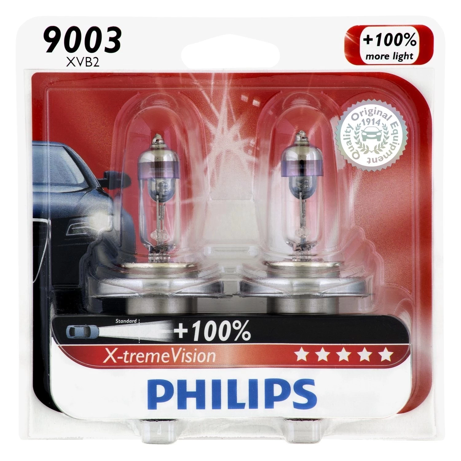 X-tremeVision Replacement Bulbs (9003) (9003XVB2) by Philips®, 1 Pair, 3400K. Boost your visibility on the road with these advanced Philips bulbs. Compared to original halogen bulbs, they offer up to 100% more light and a beam that is up to 115 feet longer which allows drivers to see better and further. Thoughtfully engineered with the latest innovations and featuring a unique filament design and optimized geometry, the X-tremeVision bulbs will deliver great performance for years and help enhance your safety while on the go.