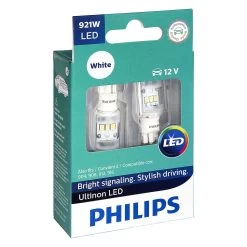 Ultinon LED Bulbs (921) (921WLED) by Philips®. 1 Pair, white color bulbs, 12V, 6000K. Replace your standard car bulbs with long lasting Philips Ultinon LED bulbs. They are a direct replacement for incandescent bulbs and are resistant to extreme heat and high vibrations. One look at their top-of-the-line design tells you these bulbs are like nothing you have seen before – Ultinon LED bulbs have been engineered to provide outstanding performance and ensure great longevity. Plus, they are backed by a 12-year limited warranty.